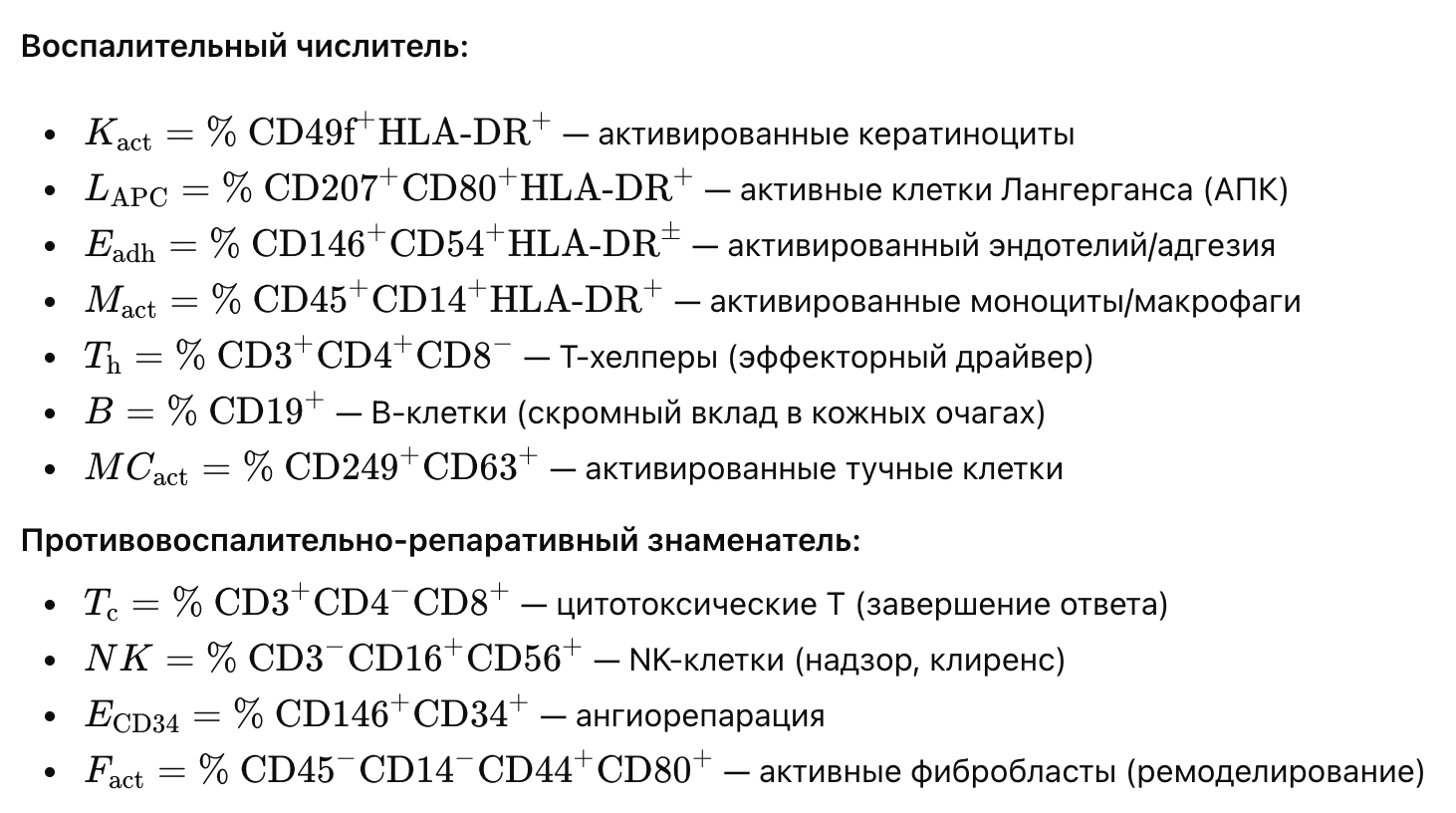 → Т.е. отношение количественного и функционального вклада клеток, участвующих в воспалительном процессе (CD45⁺, CD14⁺, HLA-DR⁺, CD80⁺, CD207⁺ и т.д.) к общей структуре клеточного пула дермы и эпидермиса в пробе.