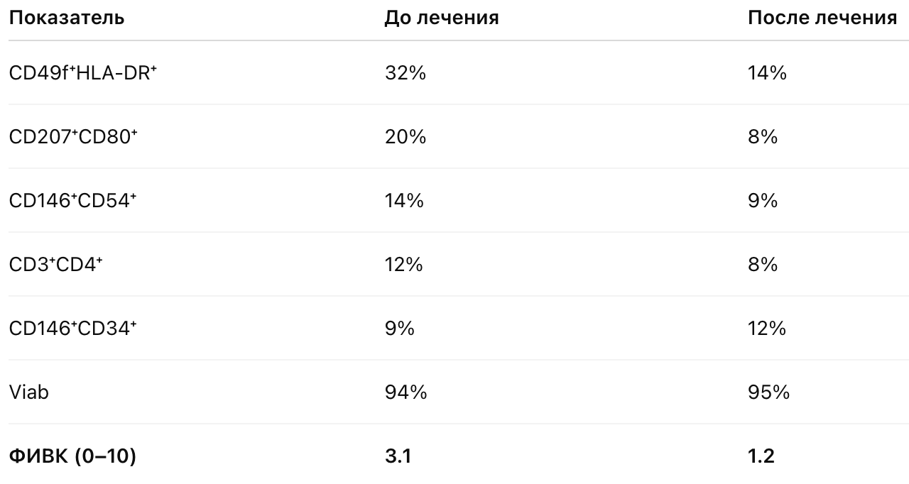 ФИВК отражает соотношение активности воспалительных и противовоспалительных субпопуляций клеток кожи, определяемых методом проточной цитометрии. Показатель позволяет перейти от морфологического описания высыпаний к объективной, числовой характеристике клеточного состояния кожи.