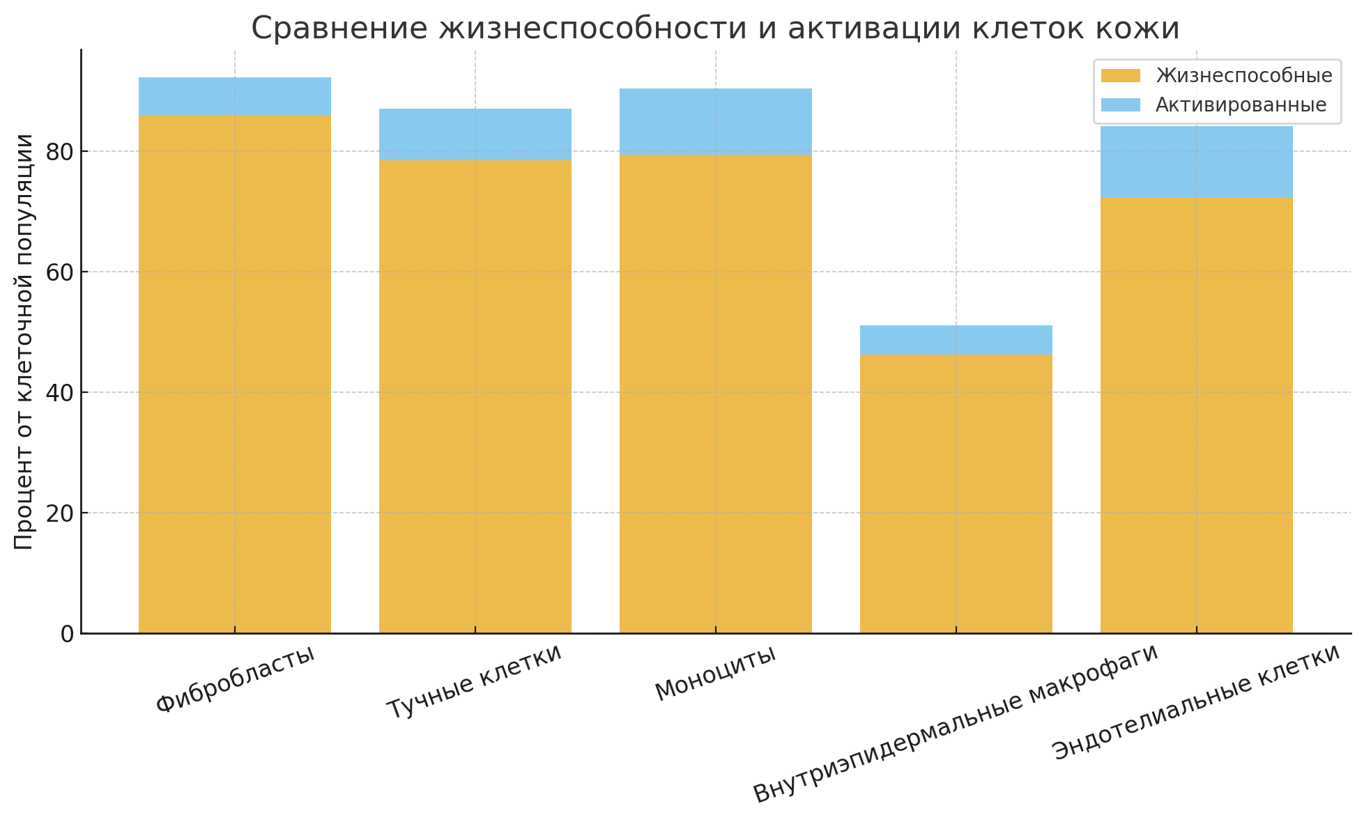 2. Уровень активации среди жизнеспособных кератиноцитов: 43.3% (41.4 / (41.4 + 54.2)) → Значительная доля клеток находится в активированном состоянии, что может быть связано с воспалительным процессом, репарацией, воздействием препарата или стимуляции in vitro.