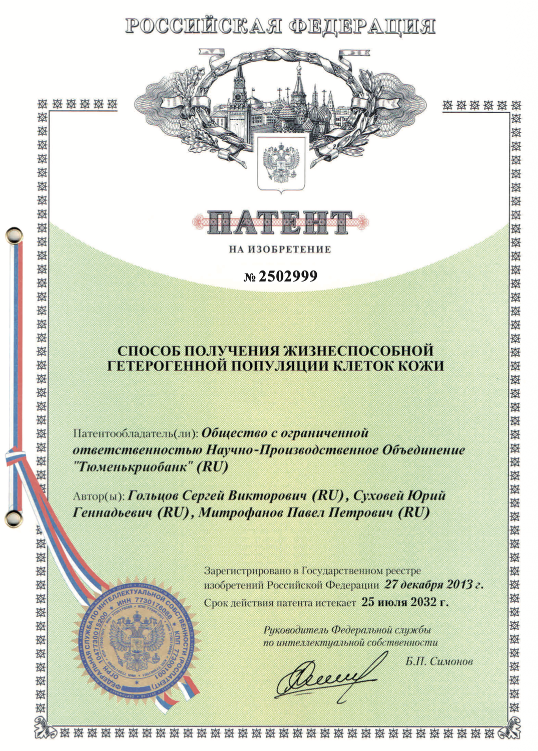 Патент на изобретение «Способ получения жизнеспособной гетерогенной популяции клеток кожи»