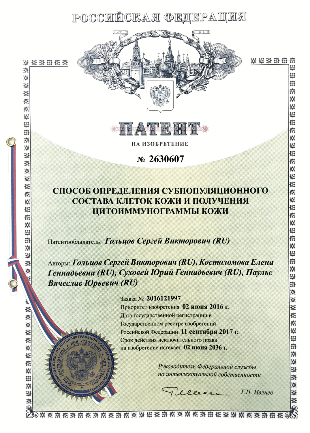 Патент на изобретение «Способ определения субпопуляционного состава клеток кожи и получения цитоиммунограммы кожи»