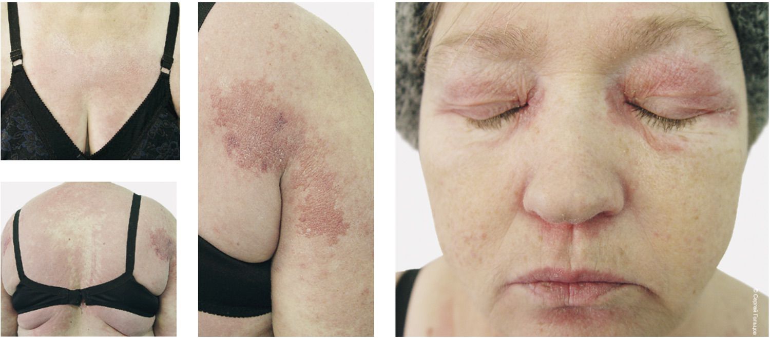 Так, при визуальном тестировании с просьбой предположить диагноз семь из десяти знакомых дерматологов с клиническим стажем более десяти лет не смогли даже заподозрить дерматомиозит. Хотя, казалось бы, что может быть проще? Отечные эритемы винно-красного цвета в области лица, шеи, тыла кистей, в области коленей долгое время могут быть единственными проявлениями этого заболевания. В данном случае была представлена периорбитальная очкообразная эритема, вследствие которой лицо приобрело «плаксивое» выражение, в сочетании с типичными симметричными поражениями кожи туловища и конечностей (рис. 2). Двое дерматологов предположили генерализованную форму рубромикоза, а один доктор токсикодермию.