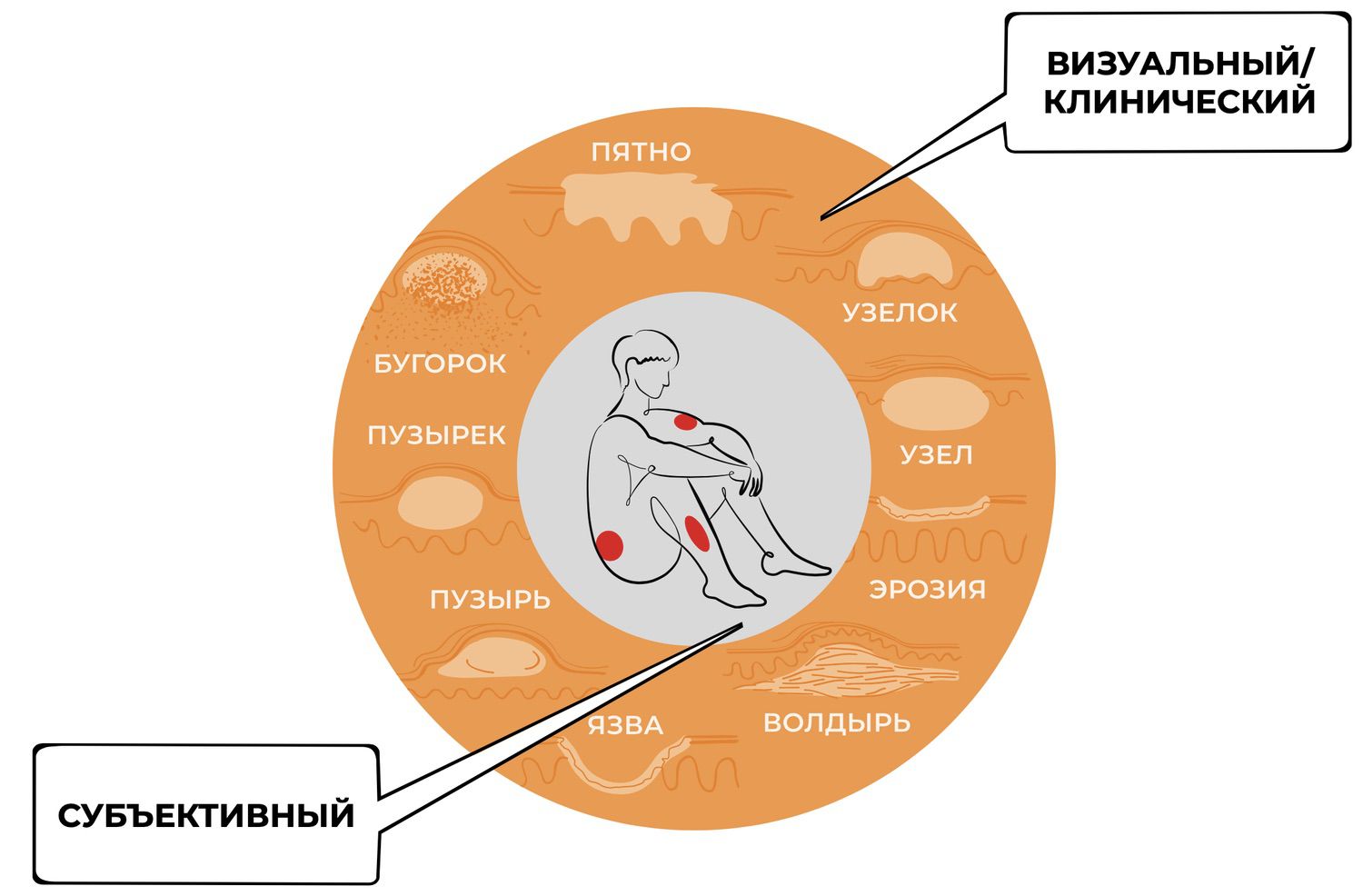 Но при обсуждении видимой части воспалительных процессов и патогенетических механизмов, лежащих в основе их появления, следует рассматривать их частями единого целого. Точнее, как систему разнородных объектов, объединенных в одно целое – кожу человека. Функционально взаимодействуя друг с другом, эти части определяют все разнообразие наблюдаемых дерматологами элементов сыпи и их трансформаций.