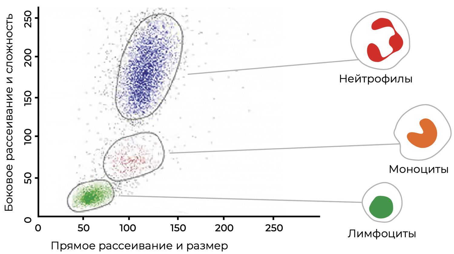 Показания, снимаемые методом проточной цитометрии, позволяют судить о морфологических характеристиках клеток (размере, отношении размеров ядра и цитоплазмы, гранулярности цитоплазмы, степени асимметрии клеток), определять субпопуляционный состав и с высокой точностью оценивать их функциональное состояние27.