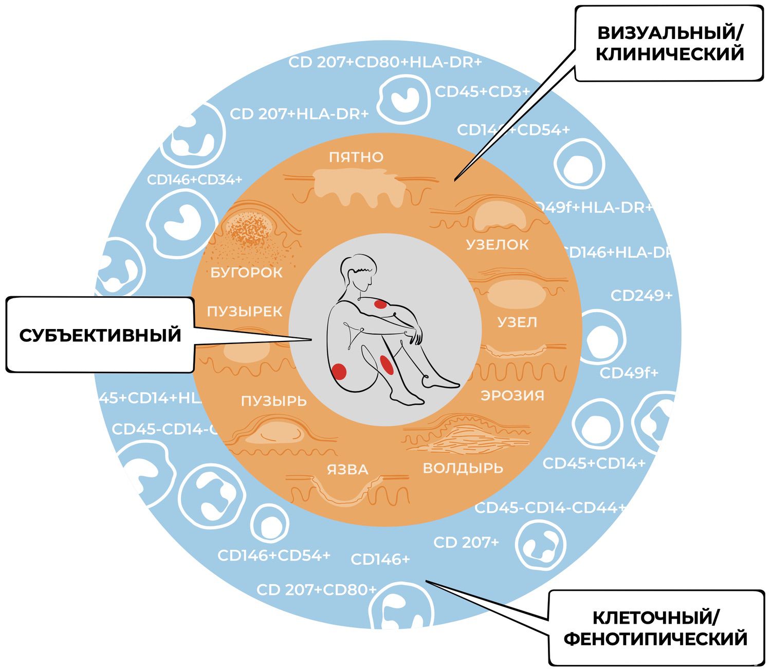 Становится очевидным, что подлинное развитие дерматологии не представляется возможным в отрыве от клеточных технологий. При этом клеточные технологии способны стимулировать обновление дерматологии, что позволит досконально изучить процессы формирования разнообразия клеток кожи, их специализацию и избирательность функций, тем самым расширить познавательную активность дерматологов. В нашем случае новым уровнем считывания симптомов – клеточным, фенотипическим (рис. 9).