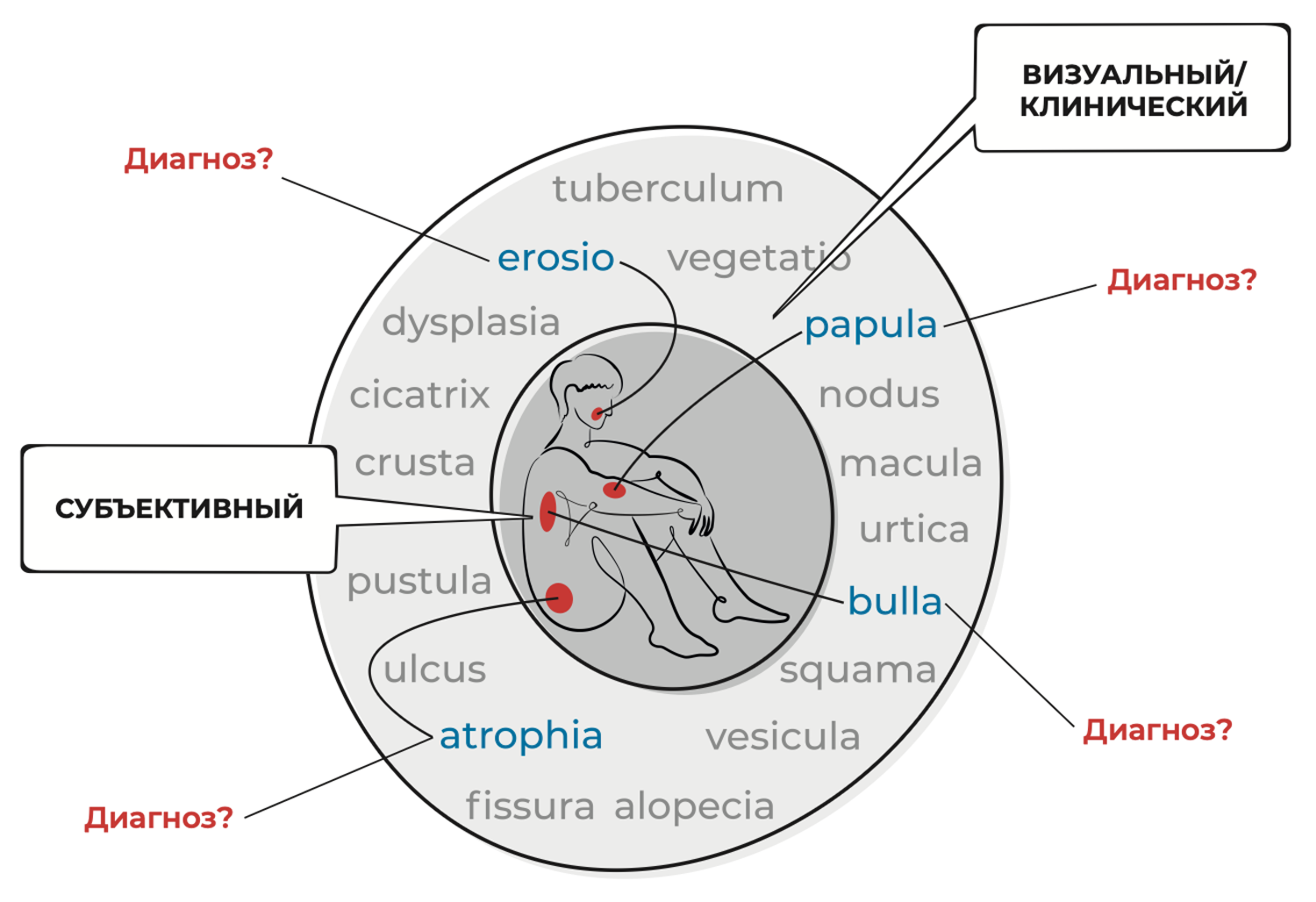 Дефицит патогенетических сведений о морфологических проявлениях заболеваний кожи заставляет дерматологов упрощать наблюдаемые явления до известных диагнозов, обосновывая диагностику и лечение заболеваний кожи только визуализацией последних. Зачастую при постановке диагноза дерматолог использует известные ему абстрактные понятия, отношения между которыми только приблизительно отражают связи между реально существующими клетками кожи и их функциями. Бесспорно, диагнозы имеют значение уже потому, что они относительно верно, но все же отображают свойства и отношения элементов исследуемых совокупностей. Это дает возможность описывать наблюдаемую картину и с помощью языка осуществлять накопление и передачу знаний.